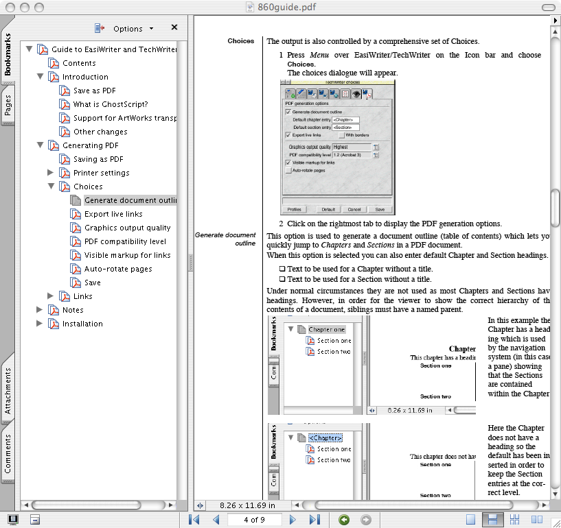 external links, i.e., links to other parts of the same document and Here is an example of a PDF document created by Easi/TechWriter displayed on an Apple Macintosh using Adobe Reader showing the automatically generated document outline (bookmarks).