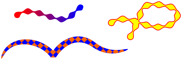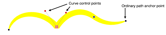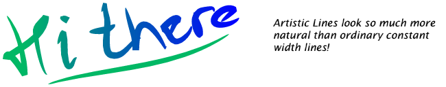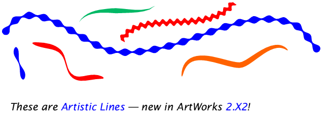 ArtWorks 2 features (15)New features in ArtWorks 2.X2Artistic Lines are similar to ordinary lines, except that their width varies along the path. The way the width changes is determined by the applied profile. Despite their complex shapes Artistic Lines can still be edited like ordinary lines, and you can change their widths and profiles at any time. Even better: In contrast to ordinary lines you can apply graduated fills to Artistic Lines, and you can even give them an outline colour! Or what about a Hatch fill? Remember, these are still lines. You can edit them using the usual path anchor and control points: