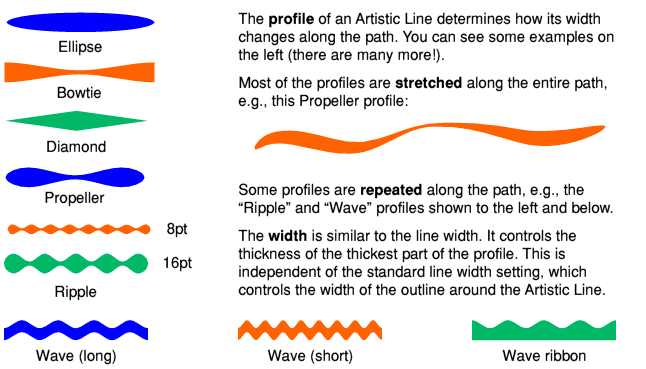 Applying a profile is easy: Simply choose one from the Artistic Lines are drawn using the Freehand tool. Choose your profile and width and scribble away! Other new features: