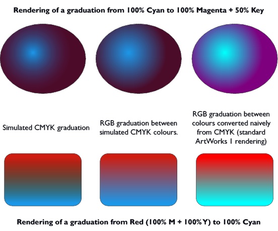 professional printers. For example, the simulated CMYK graduation of the rounded rectangle reveals