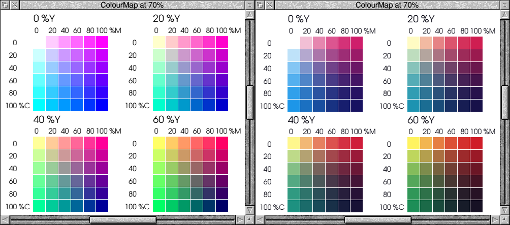 standard naive CMYK rendering (left) and using CMYK ink simulation (right). A professional print