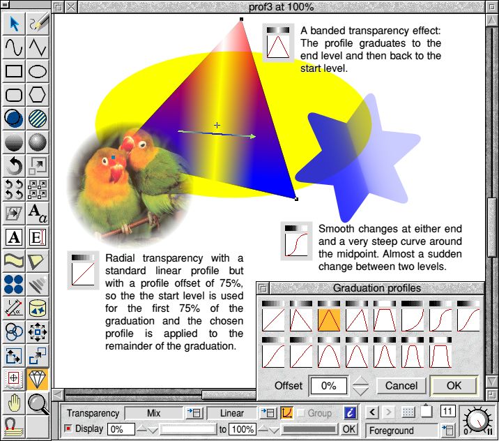 The Crystal tool added transparency to ArtWorks. ArtWorks 2.3 comes with a far more powerful version of this tool offering graduated transparency, graduation profiles and profile offset control.